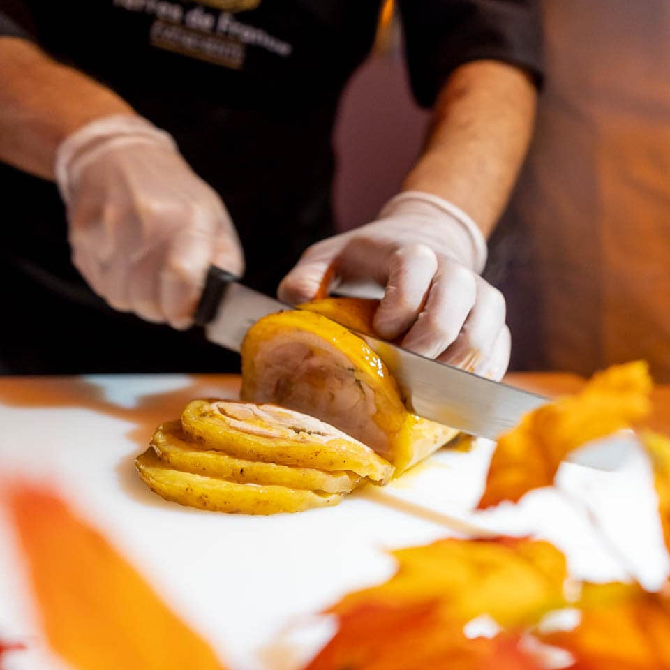 Cette préparation met en valeur la chair moelleuse du chapon, subtilement relevée, pour offrir une expérience à la fois légère et gourmande. La gelée, douce et parfumée, souligne la finesse naturelle de la viande sans l'alourdir.